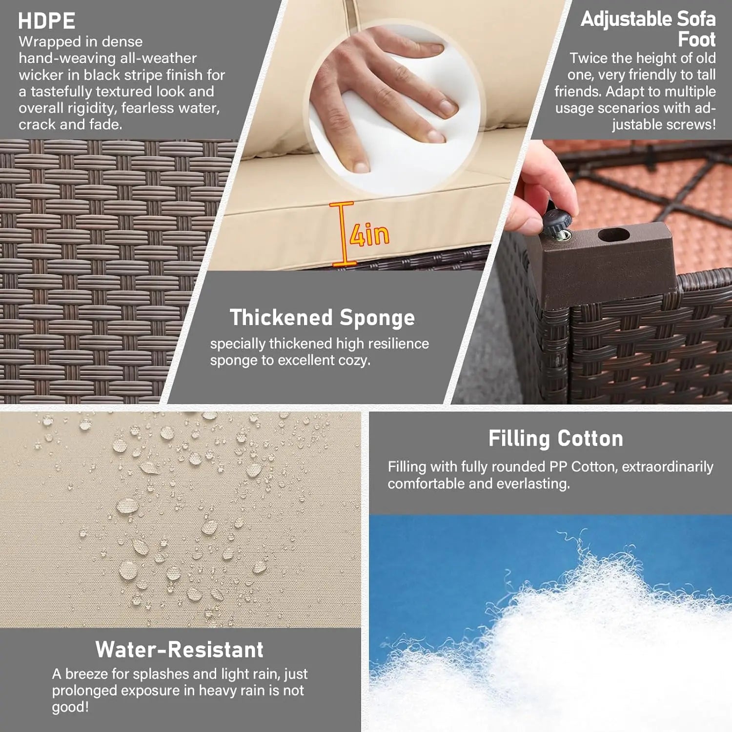 Quality & Maintain: Delicate composite weaving with half-moon and round all-weather HDPE wicker material handwoven over fully-welded powder-coated steel framing makes outdoor patio furniture very durable and sturdy. Breathable 250G polyester Anti-UV and water-repellent fabric. Each piece is designed to withstand sunshine beating down and rainstorms rolling through.